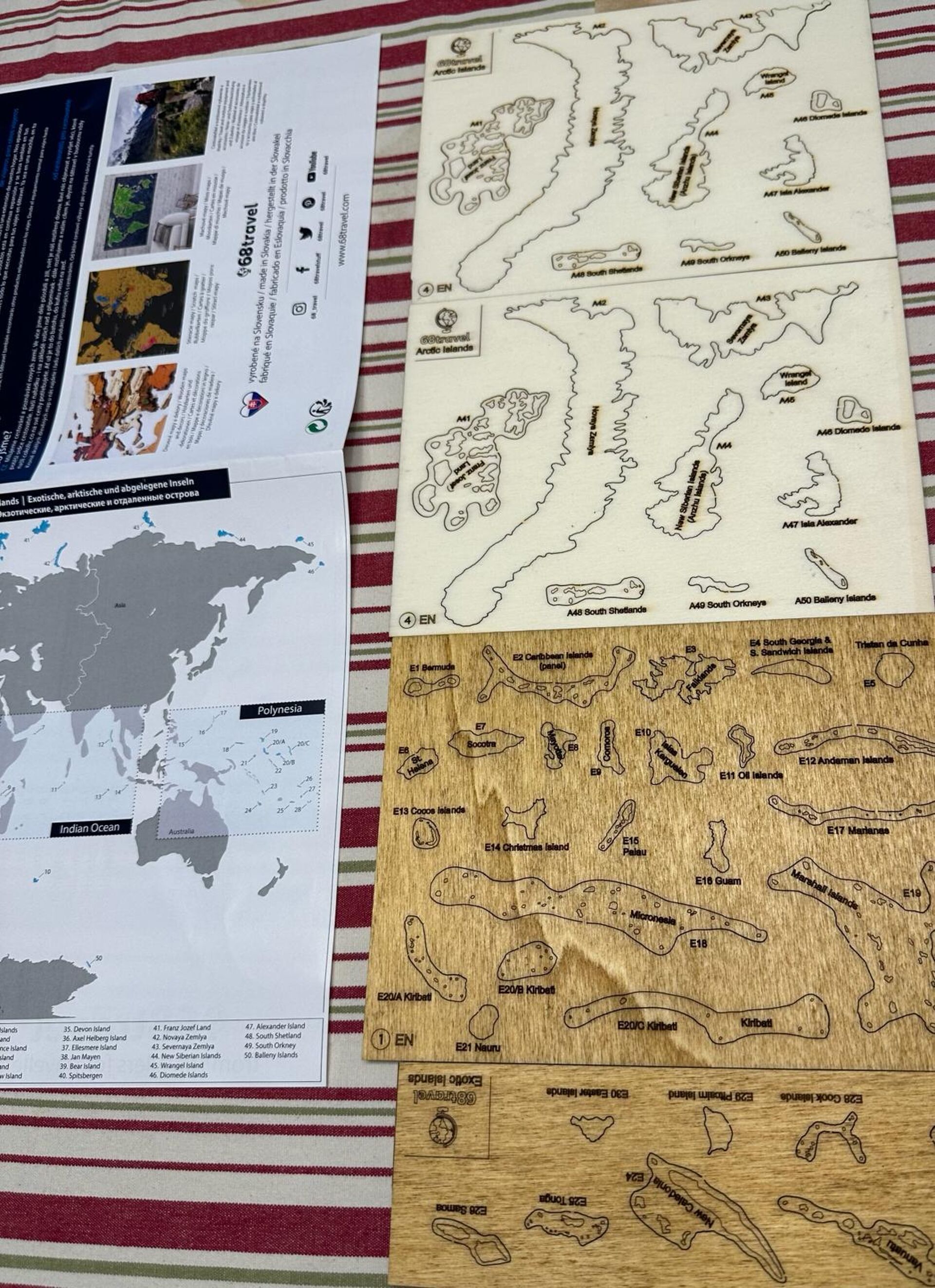 Dit product bevat geen plakband. U kunt de tape gebruiken die bij uw houten kaart is geleverd of u kunt een extra rolletje kopen in de accessoires sectie. Er wordt een papieren gids meegeleverd waarop de locaties en vormen van alle eilanden staan aangegeven. Houd er rekening mee dat de meeste eilanden door de beperkingen van de natuurlijke houtproductie zijn opgeschaald - wat betekent dat ze geen getrouwe 1:1 geografische weergave zijn.