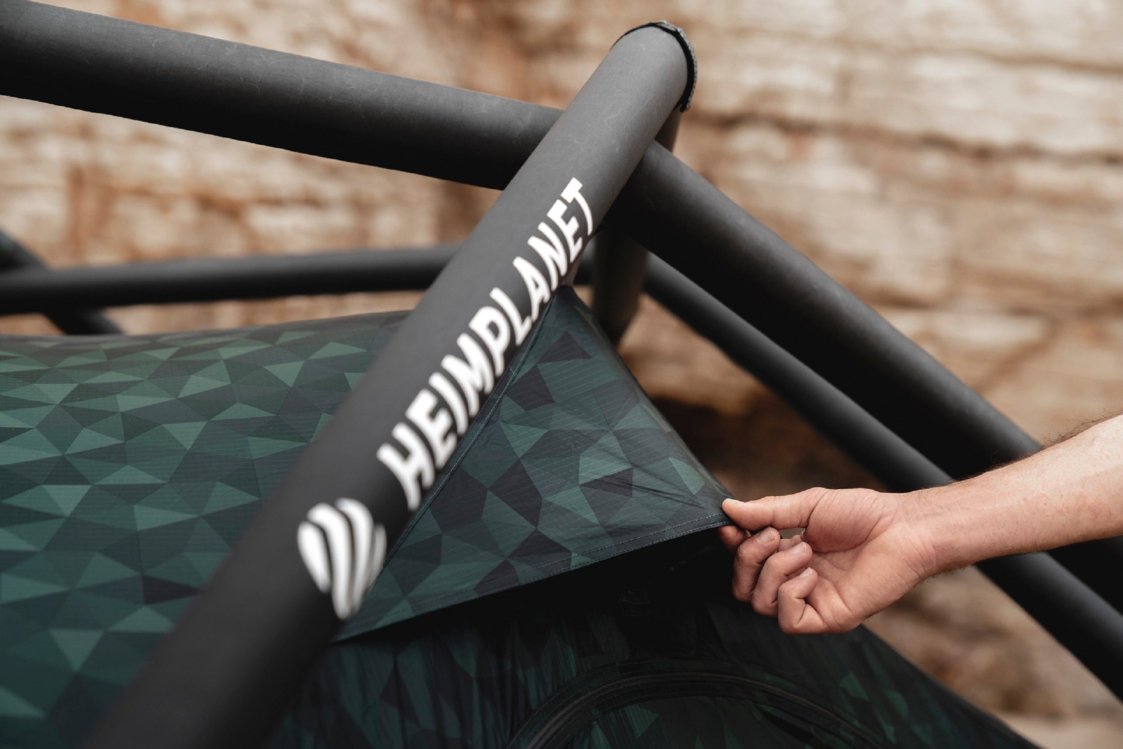 Uw Heimplanet tent bestaat in eerste instantie uit drie delen: Binnentent, Flysheet en Airframe. Voor het eerste gebruik wordt de zogenaamde Eerste Montage uitgevoerd. Hierbij wordt de buitentent in het Airframe gehaakt en vervolgens wordt de binnentent aan de buitentent bevestigd. Maakt u zich geen zorgen, de bijgeleverde instructies helpen u hierbij! Om dit proces te vereenvoudigen, gebruiken we een kleurcodering die u vertelt welke verbindingen waar moeten komen. Na de eerste montage vormt de hele tent één geheel en zijn er geen storende losse onderdelen. Vanaf dat moment is het gewoon uitrollen, opblazen en klaar!