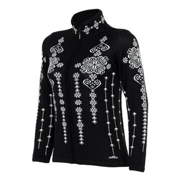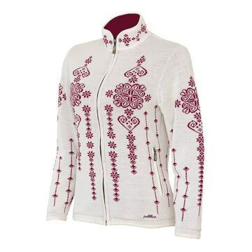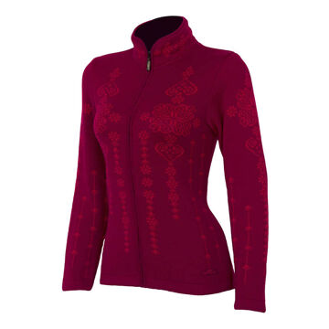 Sportief-elegante damestrui met folkloristisch patroon, geschikt als middelste kledinglaag. Medium dik gebreid ontwerp, nauwsluitend model, praktische lange YKK-rits. De trui is gebreid van hoogwaardig gemengd garen met 50% Merino wol en 50% Dralon® acryl.